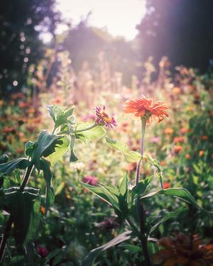 A purple flower leaning towards an orange flower under warm sunlight