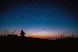 Silhouette of a person in a chair, staring at the sunrise and stars above