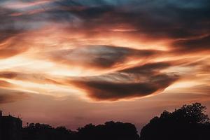 Uniquely-shaped red and gold clouds above treetops at sunset
